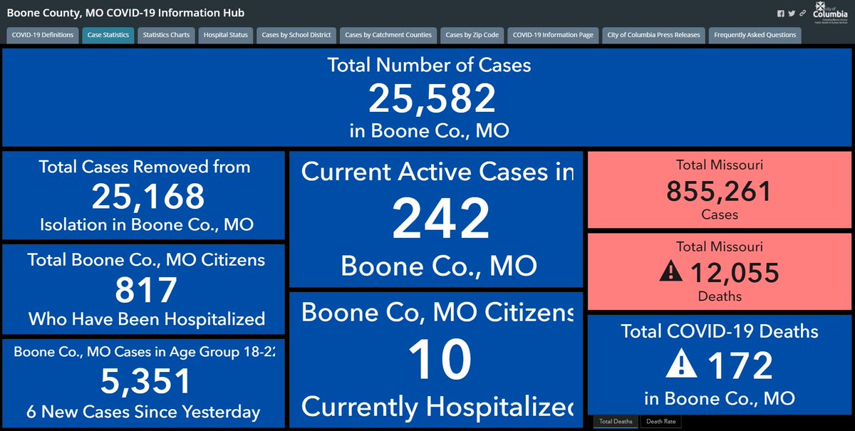 Boone County ranks eighth in the state with the most coronavirus cases in total volume in the past week. Cases are down 32.7% when comparing last week to the prior week. The county has a 6.7% positive test rate, according to the Missouri Department of Health and Senior Services (DHSS).