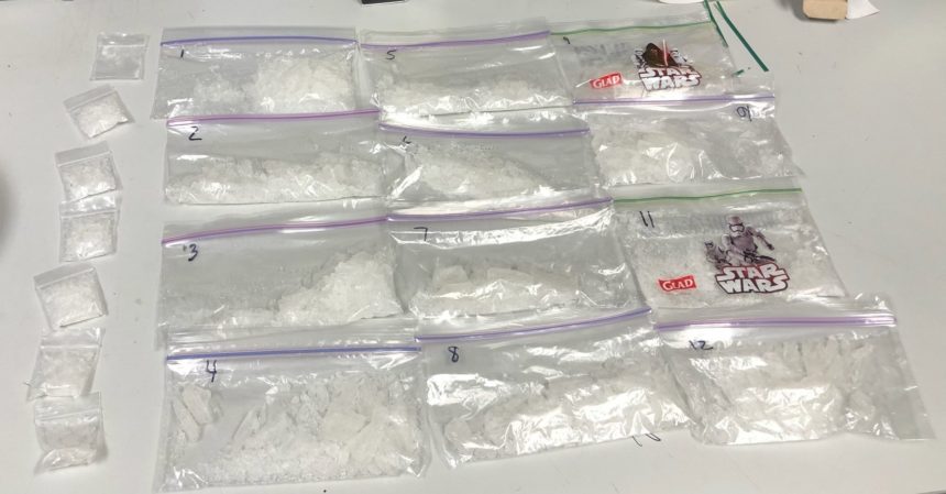 Police said about a pound of methamphetamine, syringes, scales, nine cell phones and pipes were found during officers' search of their room.
