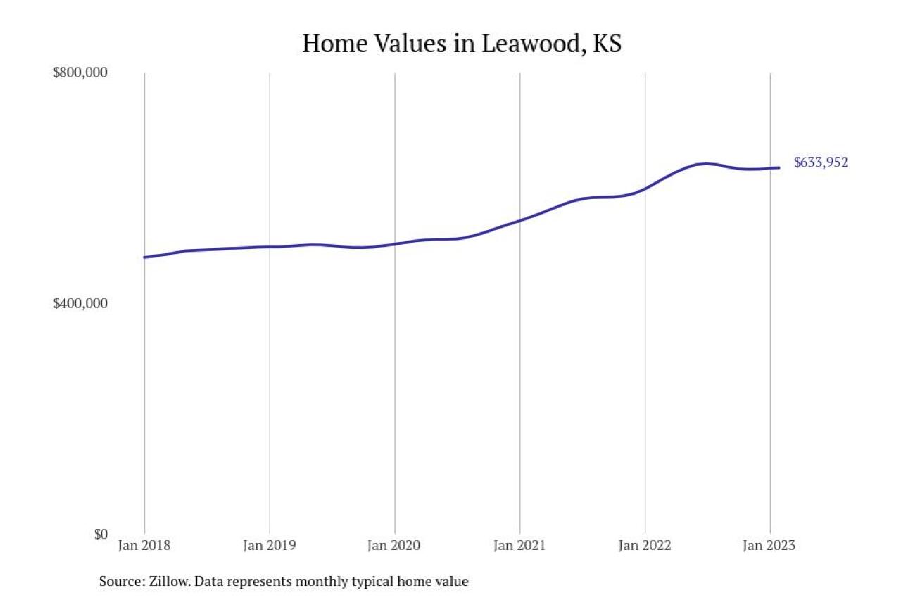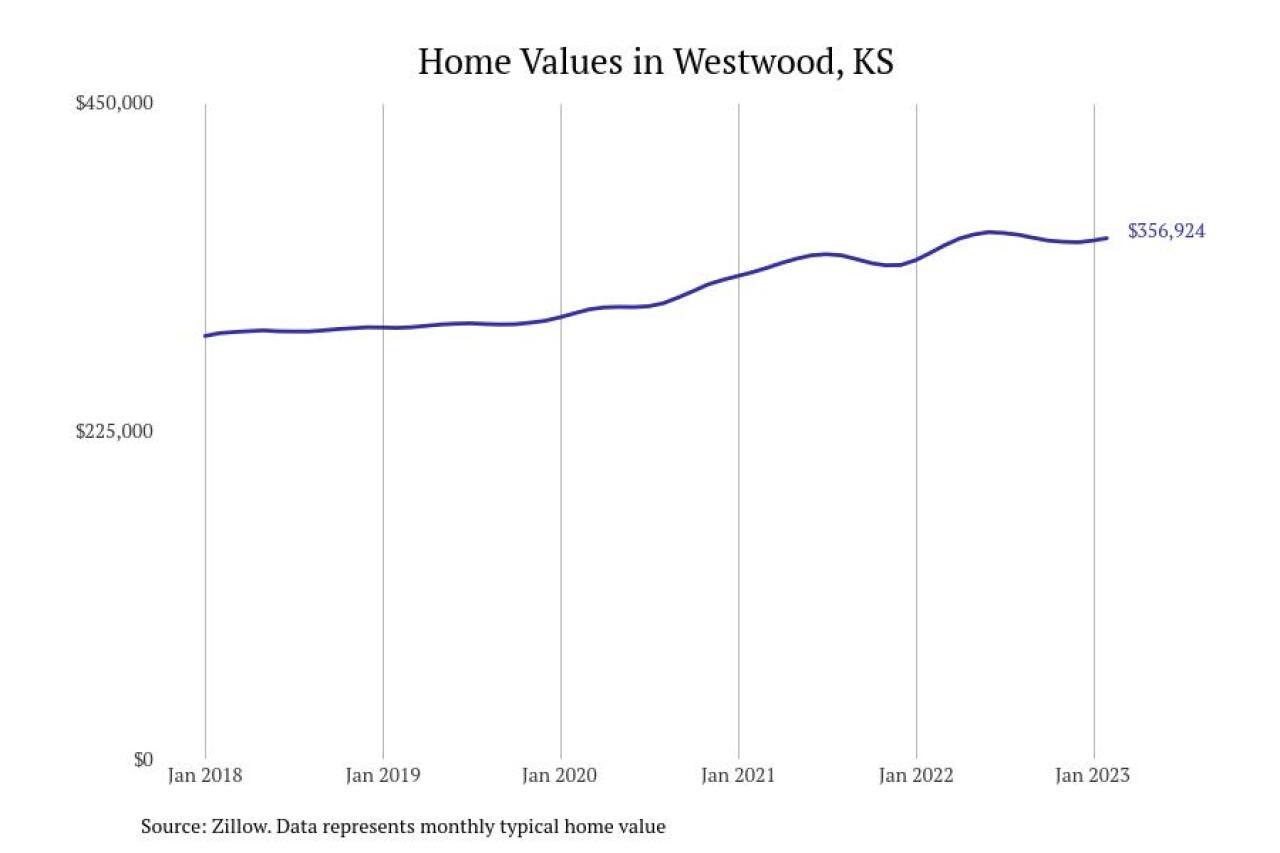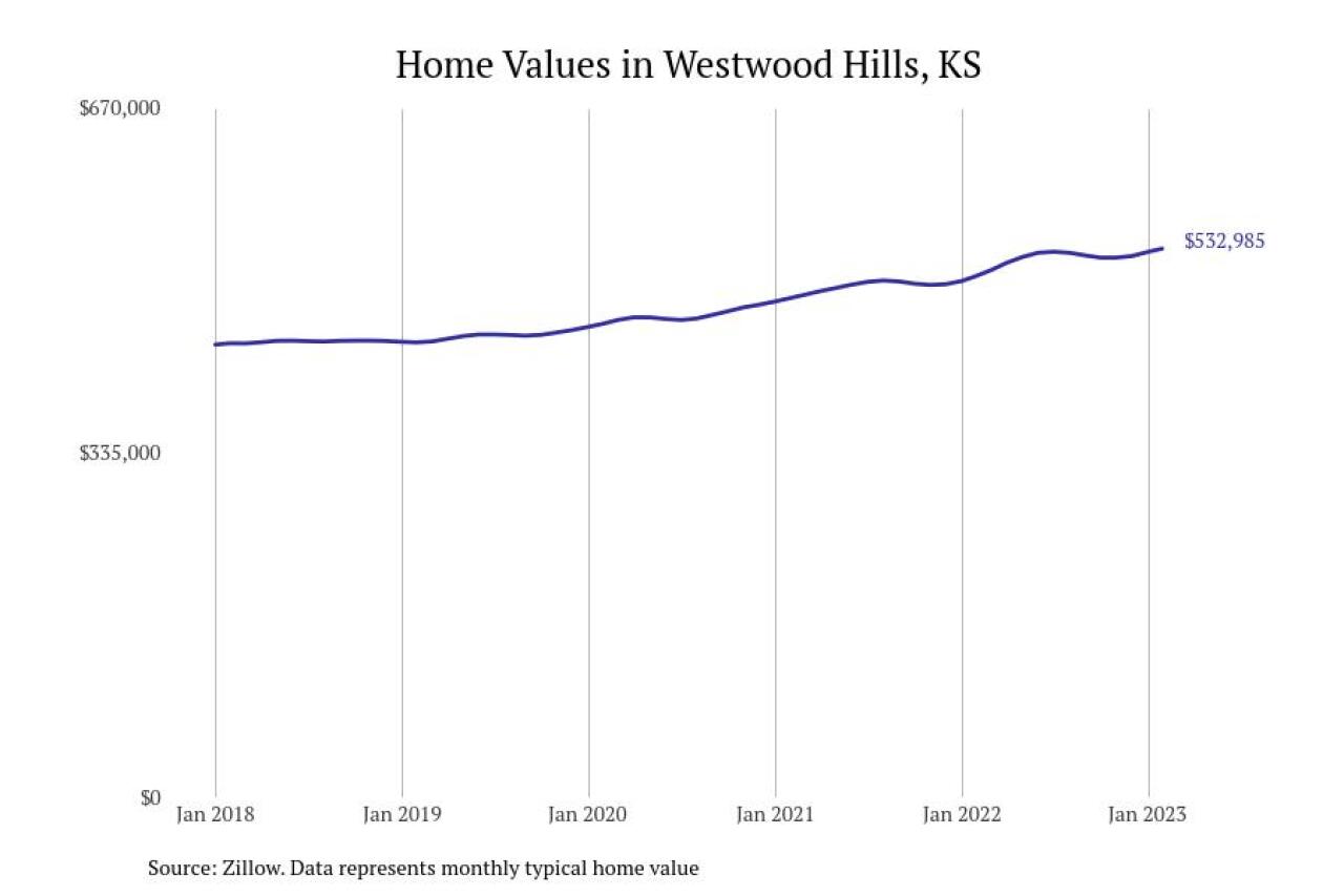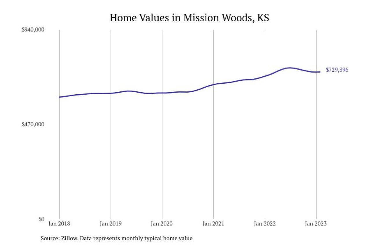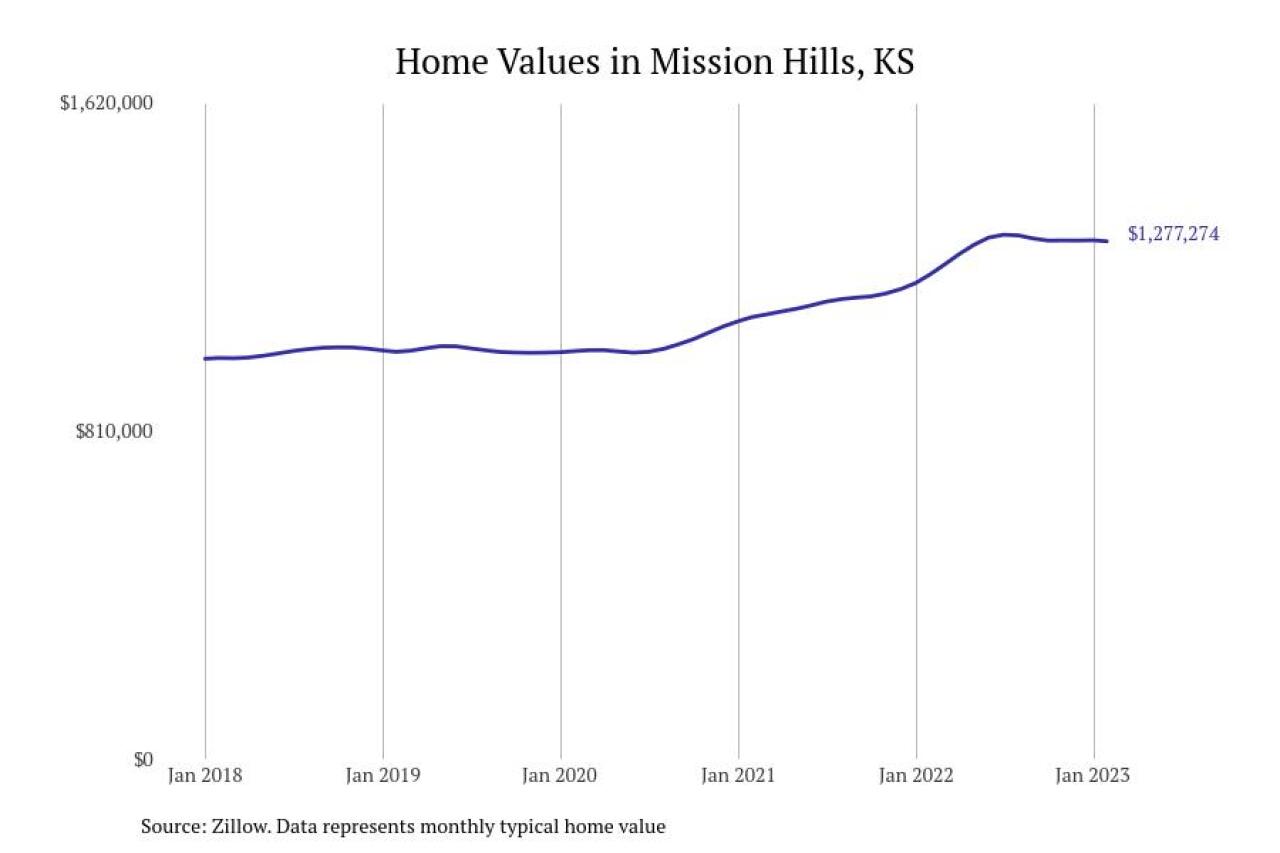 Stacker compiled a list of cities with the most expensive homes in Kansas City using data from Zillow. Cities are ranked by the Zillow Home Values Index for all homes as of February 2023. The ZVHI represents a seasonally adjusted price for the middle market for all homes. Data was available for 133 cities and towns in Kansas City. Charts for each city show the monthly typical home value since January 2018.