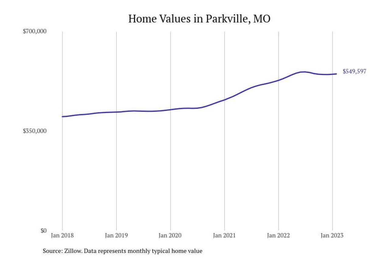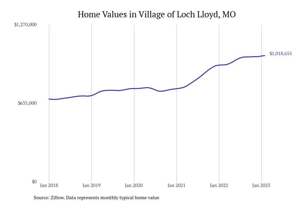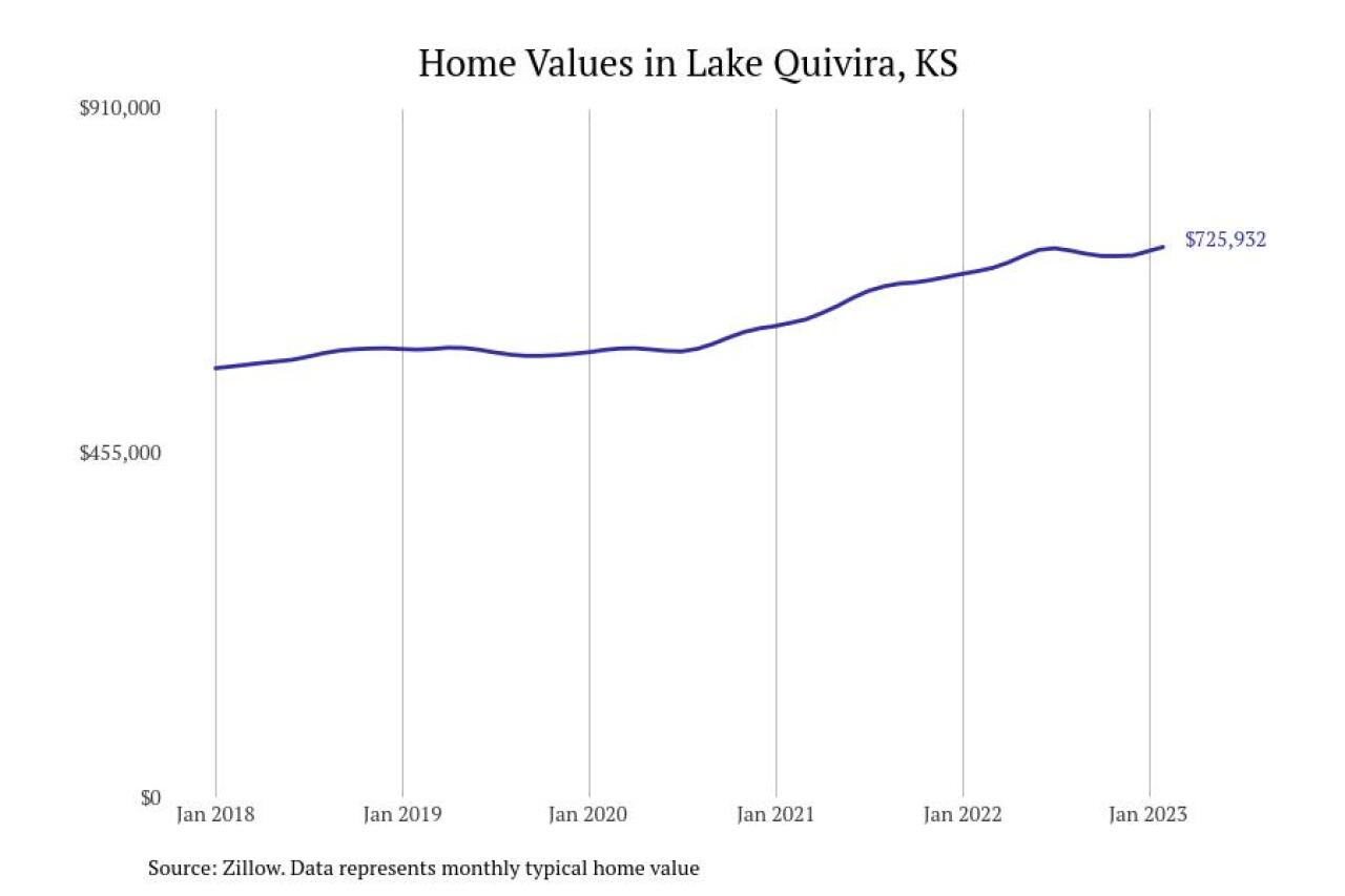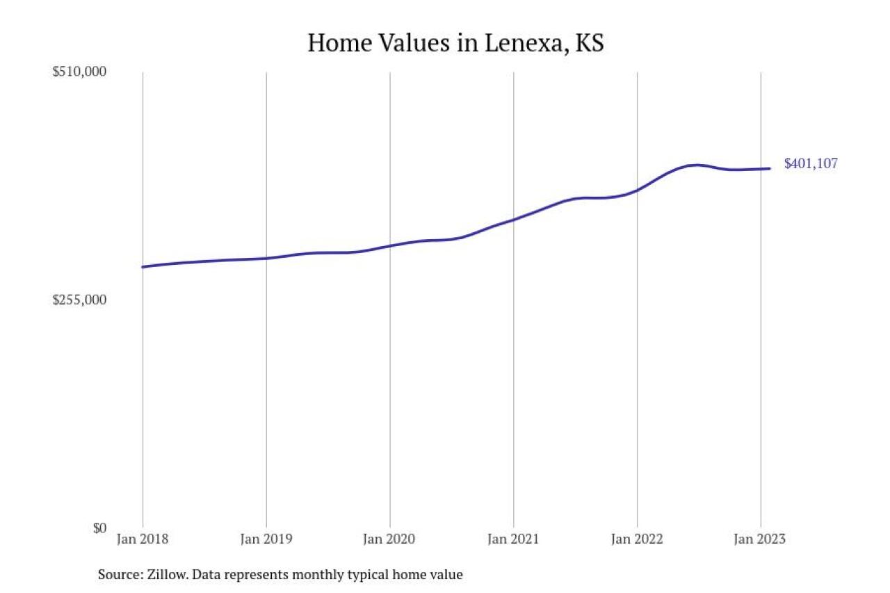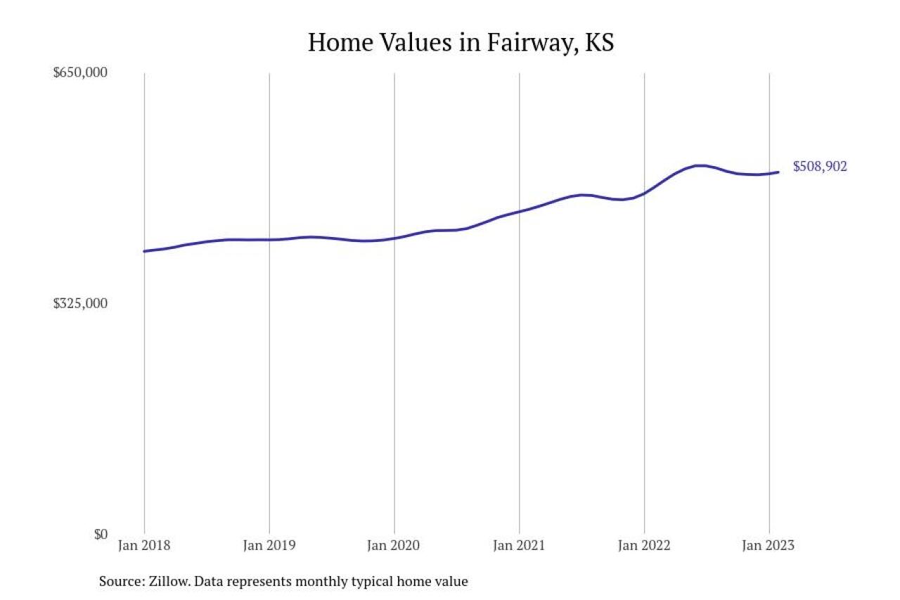 Stacker compiled a list of cities with the most expensive homes in Kansas City using data from Zillow. Cities are ranked by the Zillow Home Values Index for all homes as of February 2023. The ZVHI represents a seasonally adjusted price for the middle market for all homes. Data was available for 133 cities and towns in Kansas City. Charts for each city show the monthly typical home value since January 2018.