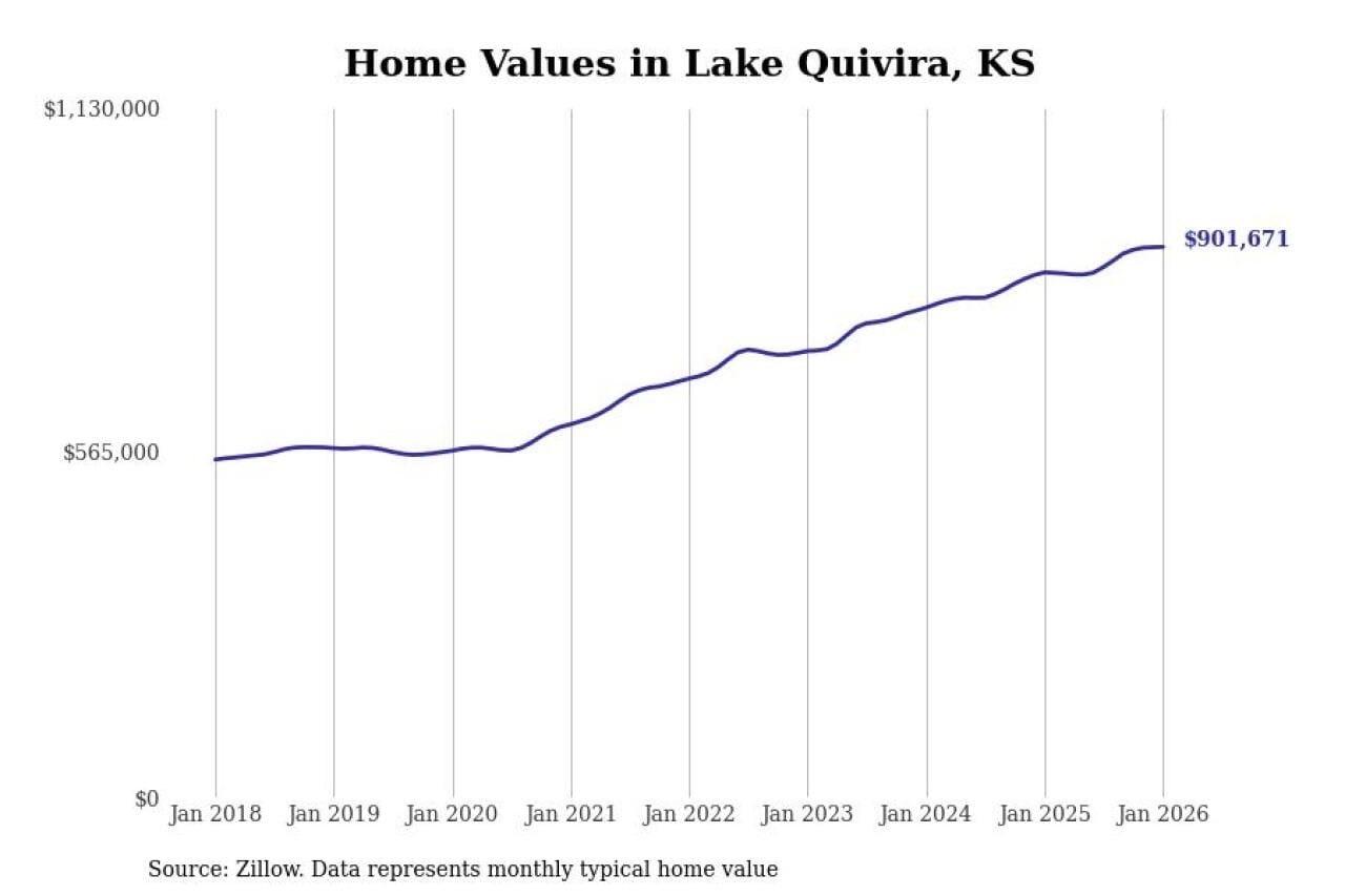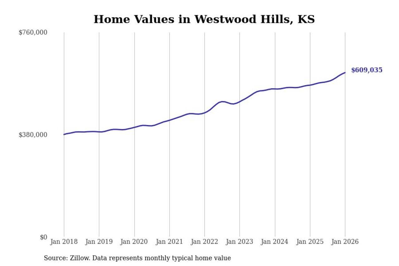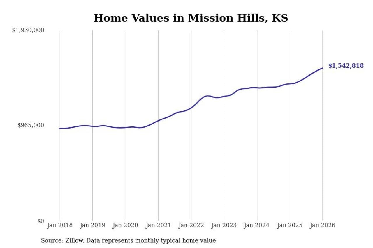Stacker compiled a list of cities with the most expensive homes in the Kansas City, MO-KS metro area using data from Zillow. Charts show the monthly typical home value since January 2018.