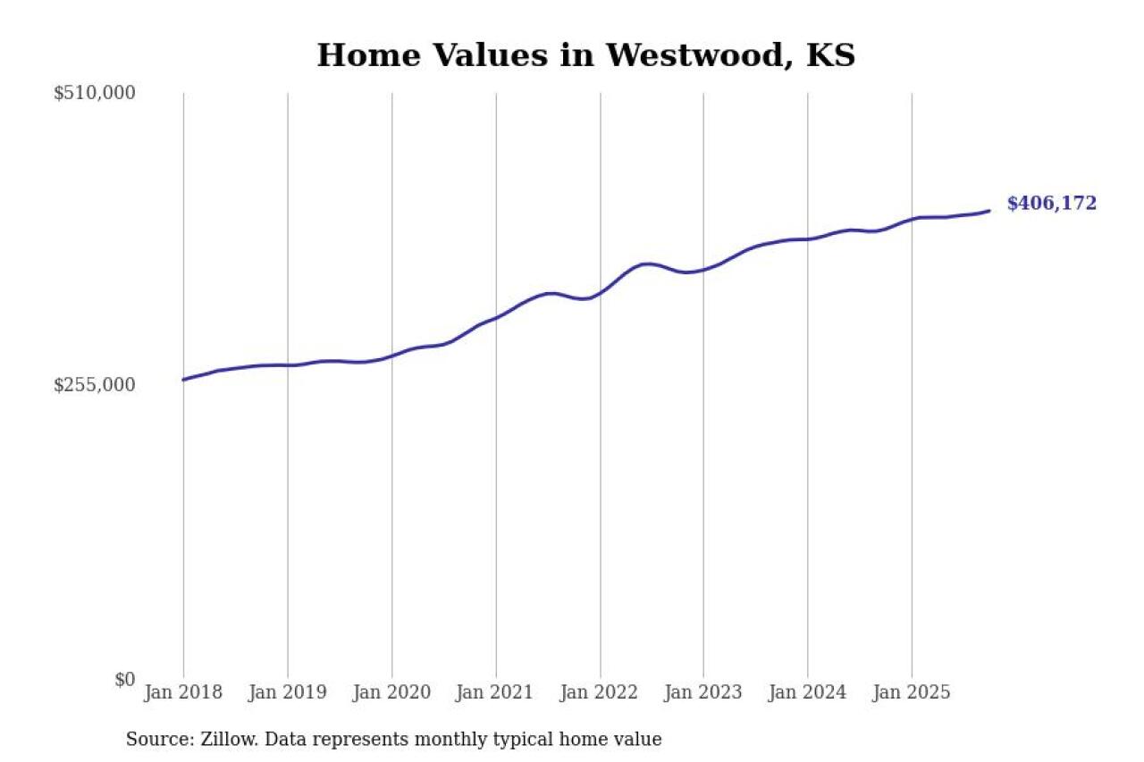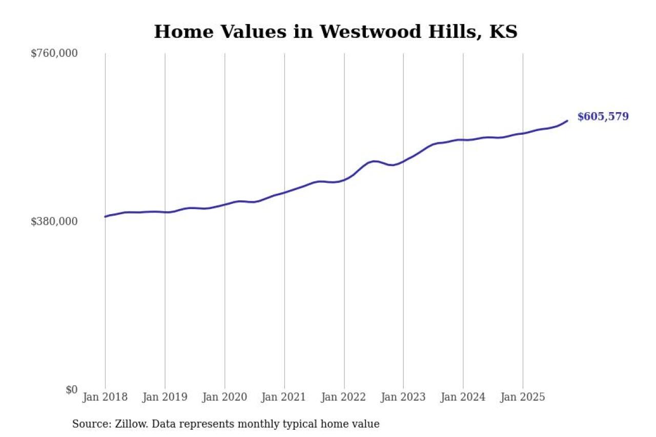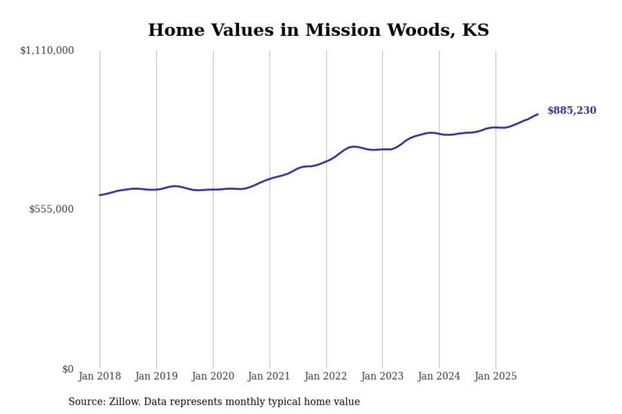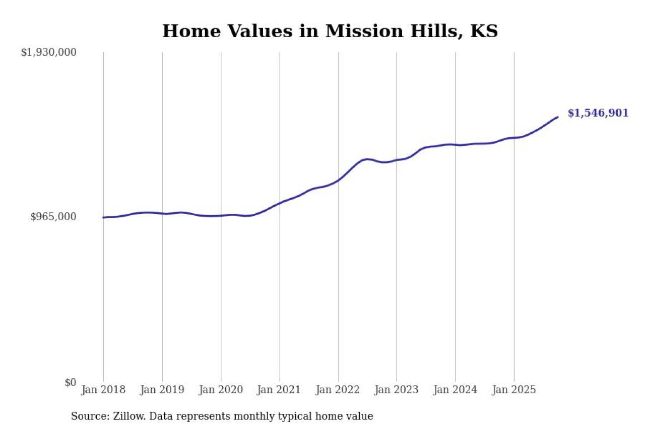 Stacker compiled a list of cities with the most expensive homes in the Kansas City metro area using data from Zillow. Charts show the monthly typical home value since January 2018. Data was available for 134 cities and towns.