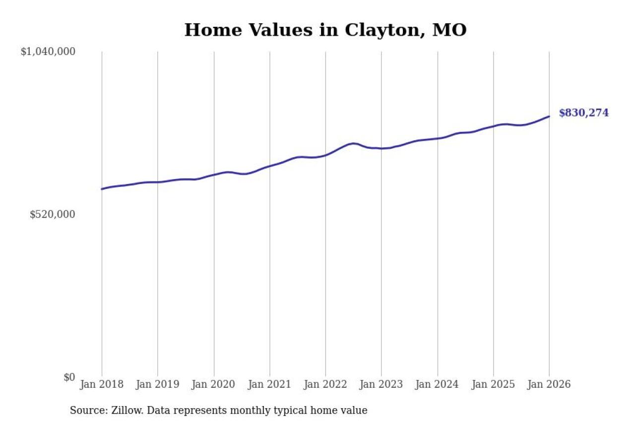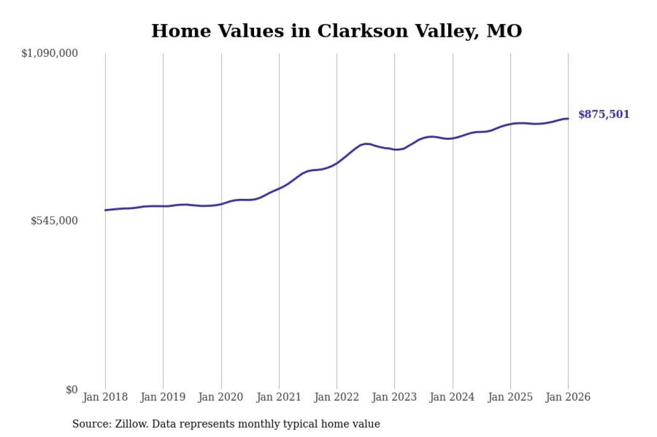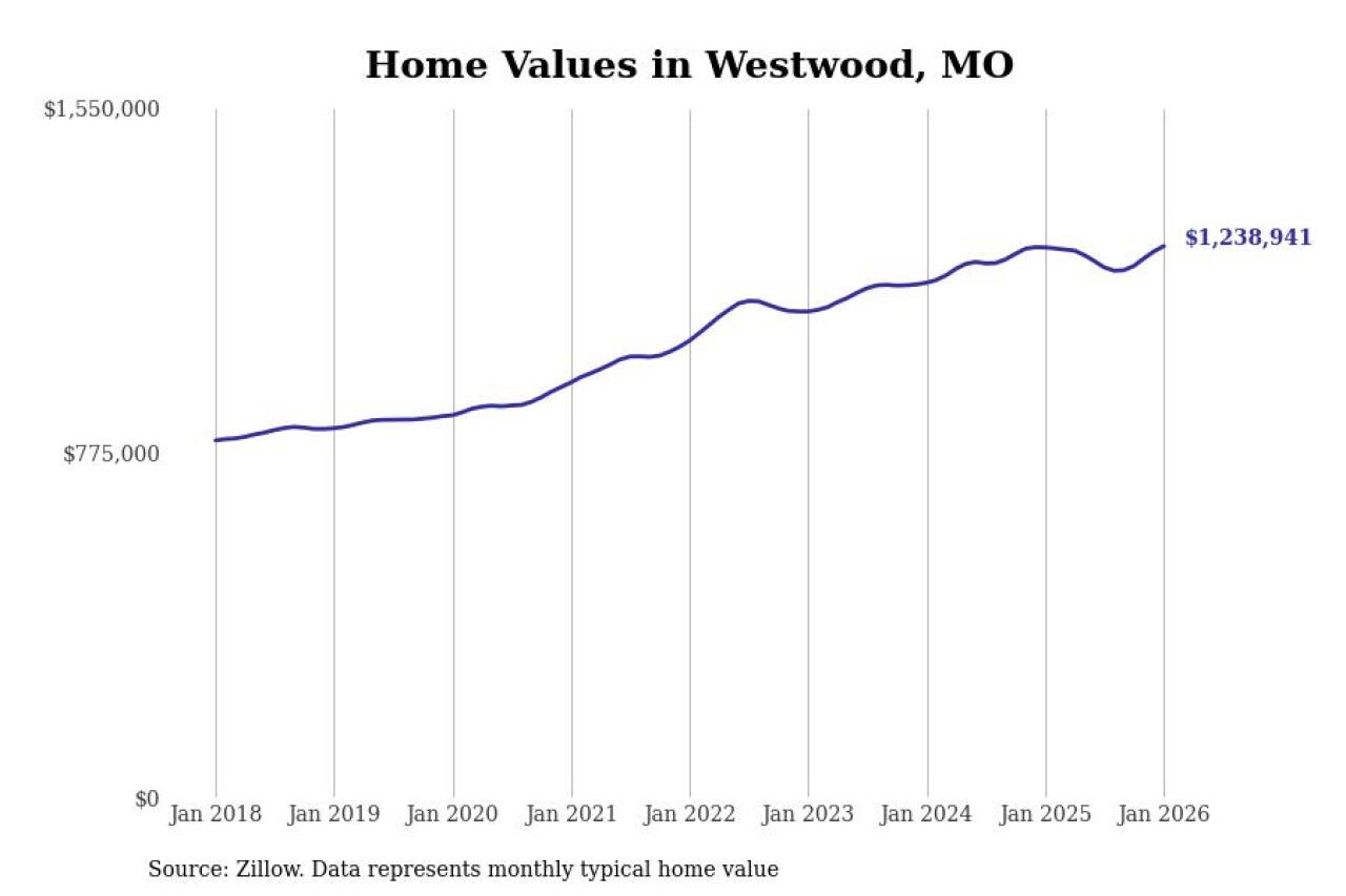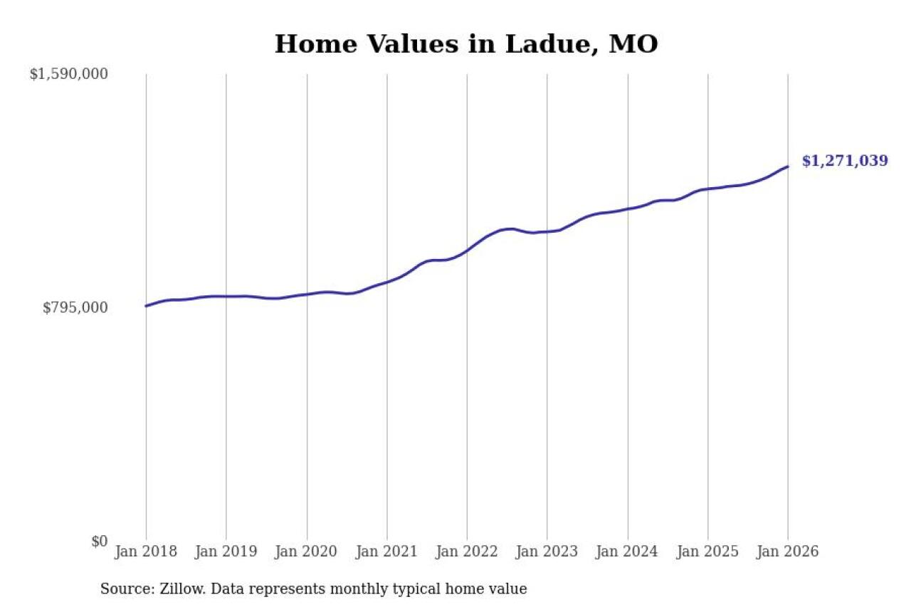 Stacker compiled a list of cities with the most expensive homes in Missouri using data from Zillow. Cities are ranked by the Zillow Home Values Index for all homes as of January 2026. The charts in this story were created automatically using Matplotlib.